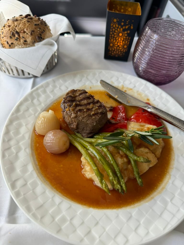 I experienced world-class food on the ground and in the air. They have similar menus and food items whether you are in the lounge or flying. Some of my favorite dishes included the Lamb Kebab, the fried shrimp noodles, and the delicious ah chef’s smooch filet mignon. The ice cream was also freshly made and so good! Some of the best fixings on a flight I have ever had.
