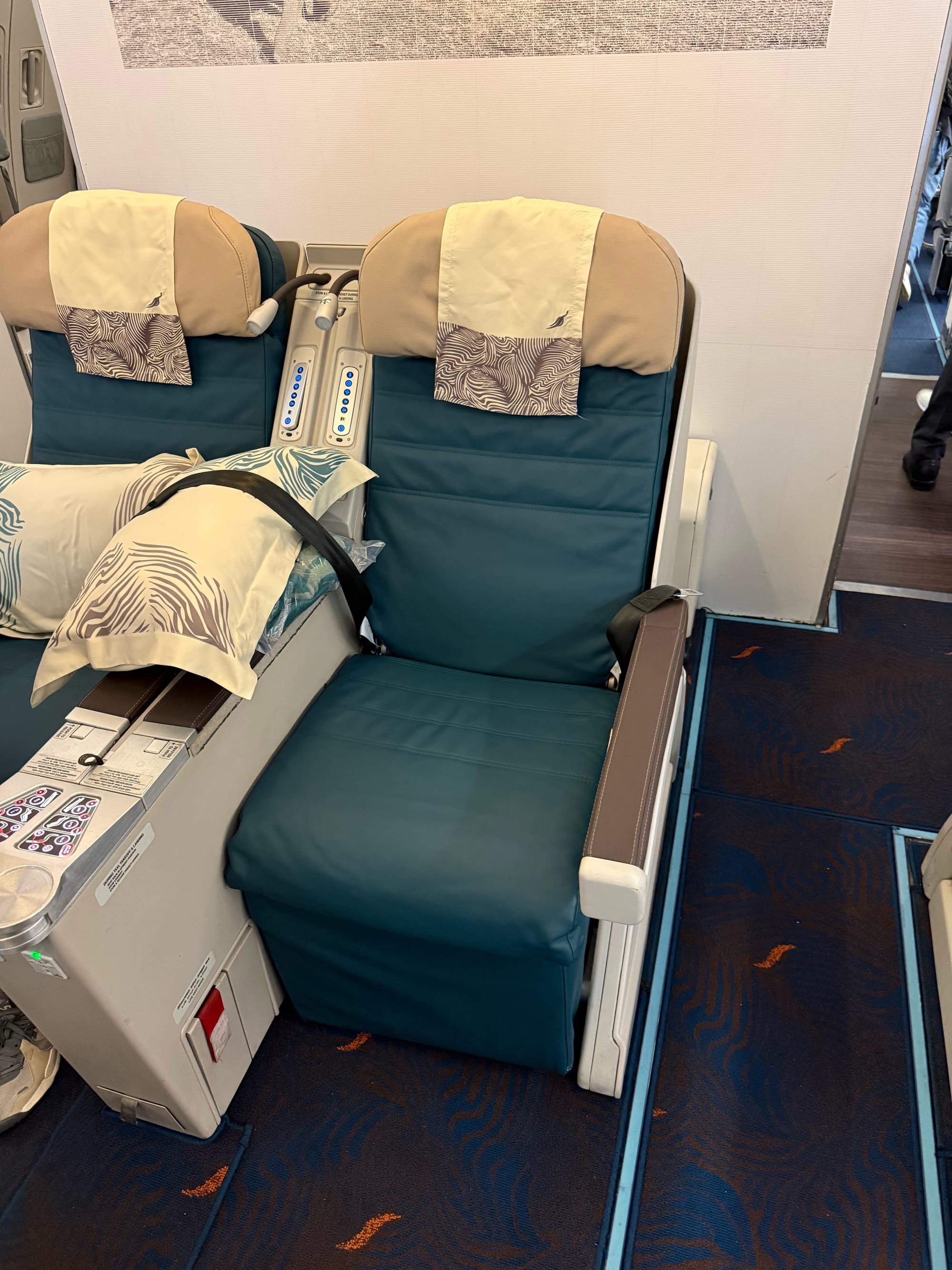 The seat was a surprise sleeper hit. This may have been my first business class seat with a massage function. I also LOVED the size. It was big and comfortable. When compared to the albeit newer QSuites seat, this was wider, longer, and had more feet room. There wasn’t much in the way of pockets or cubbies to hold things on the seat, but the deposit boxes directly in front made up for the lack of storage.